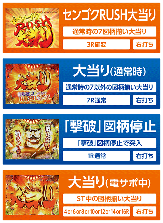 電サポ中の大当りは4R〜16Rですべて確変。ラウンド終了後はST「センゴクRUSH」突入or