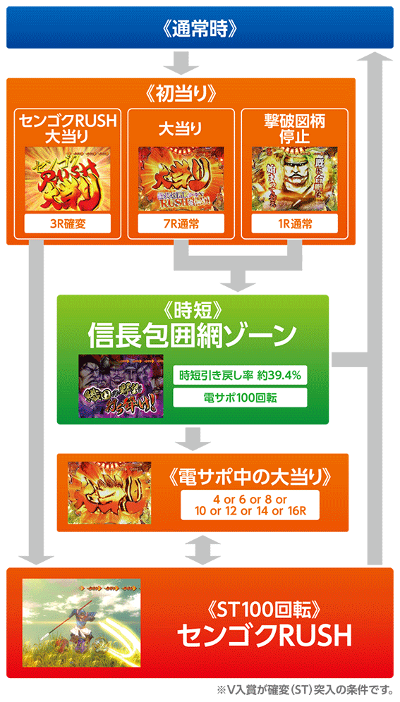 通常時の7図柄揃いは3R確変となり、ラウンド終了後はST「センゴクRUSH」へ直行する。初当り時の振り分けとしては少ないので、当たればラッキーくらいに思っておこう。