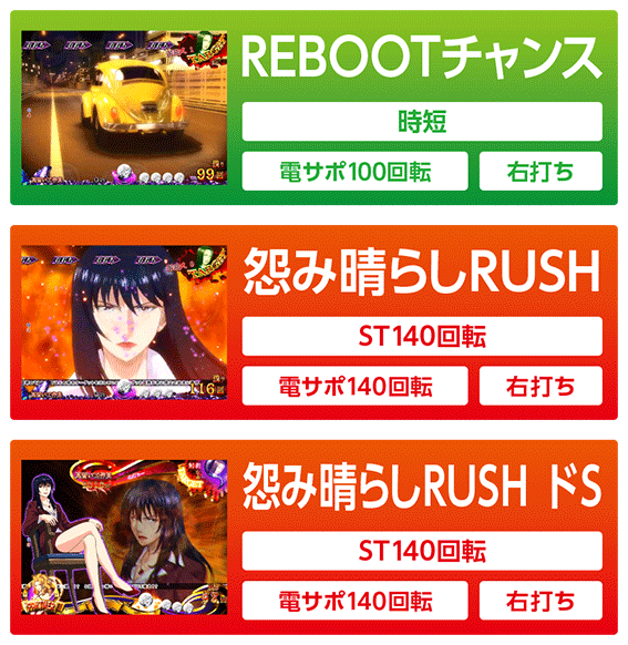 3or7以外の図柄揃いの初当りは「復讐BONUS」。ラウンド中に怨ギミックが完成すればST「怨み晴らしRUSH」突入、失敗した場合は時短「REBOOTチャンス」突入となる。