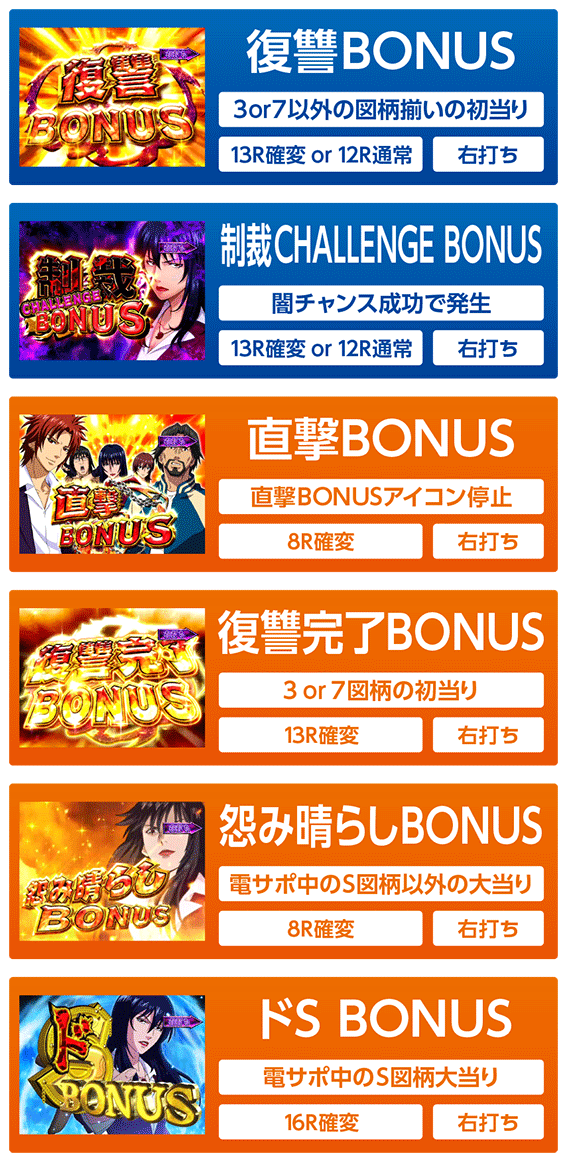本機のSTモードで、「復讐完了BONUS」&「直撃BONUS」後や「復讐BONUS」&「制裁CHALLENGE BONUS」で昇格に成功すると突入。なお、電サポ中は8Rの「怨み晴らしBONUS」後に本モードへ突入。