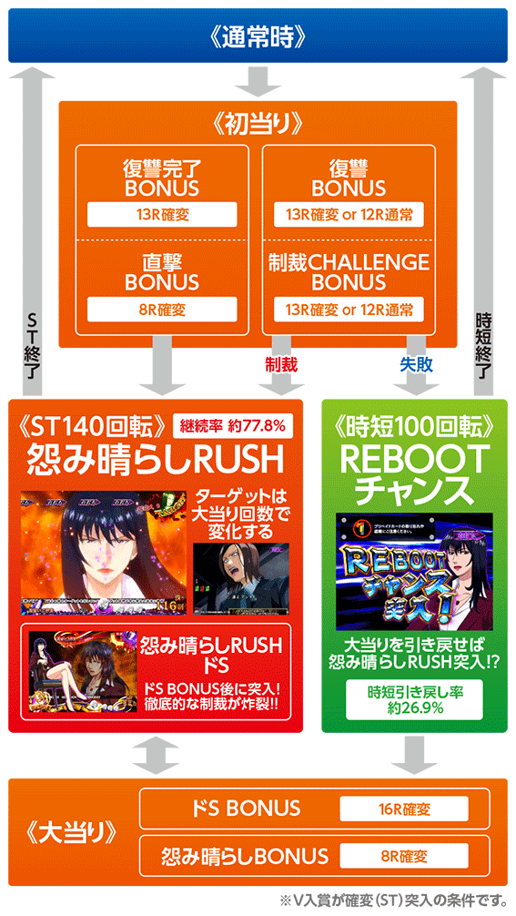 時短100回転のモードで、「復讐BONUS」や「制裁CHALLENGE BONUS」で昇格に失敗すると突入。ココで大当りを引き戻せばST突入濃厚(電チュー入賞時に限る)。