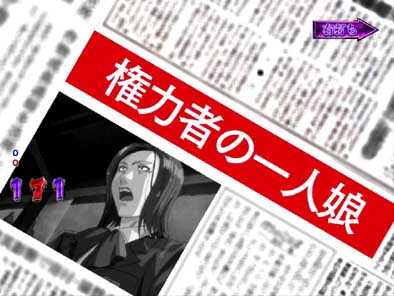 名刺図柄停止ではじまるメインの連続予告。名刺ギミックの色が赤ならチャンス、実写パターンは期待大!