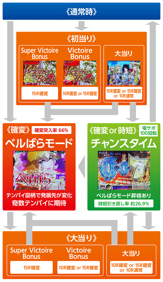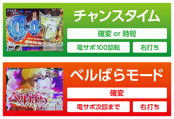 青図柄大当りでラウンド中に昇格しなければチャンスタイム突入。内部的に確変状態の場合は、100回転消化で「ベルばらモード」に移行する。