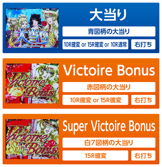 青図柄揃いで突入する確変or通常大当り。基本的にラウンド終了後は「チャンスタイム」に突入するが、時計役物が飛び出し「ベルサイユのばら」の文字がカットインすれば「ベルばらモード」突入。ばら役物作動で15R確変昇格の場合もあり。