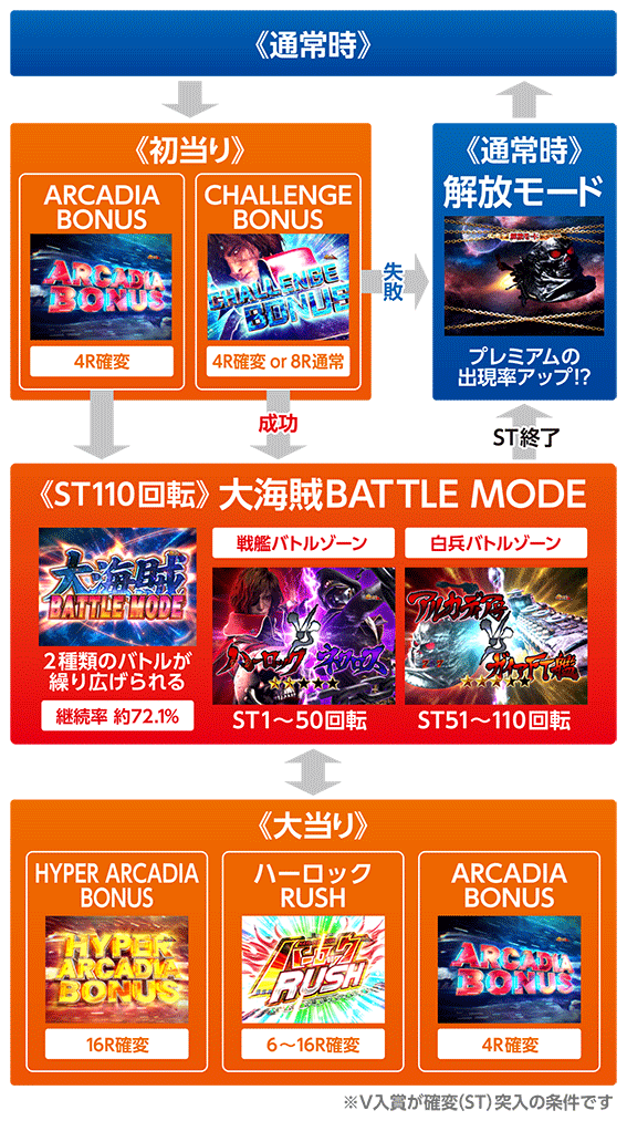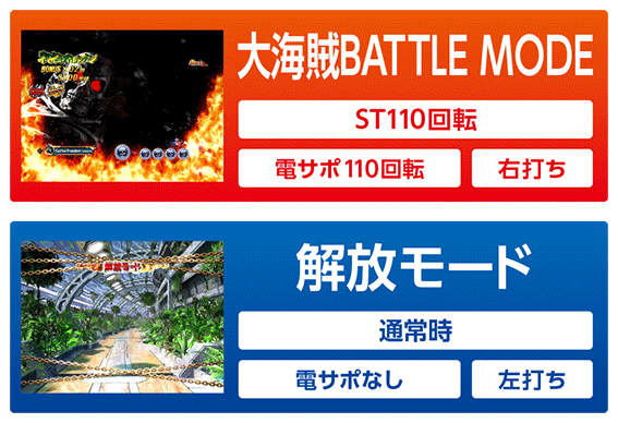 3・7以外の図柄揃いの初当りは「CHALLENGE BONUS」。ラウンド中に発生するチャレンジ演出に成功すればST「大海賊BATTLE MODE」へ突入、失敗した場合は演出用モードの「解放モード」へ移行する。