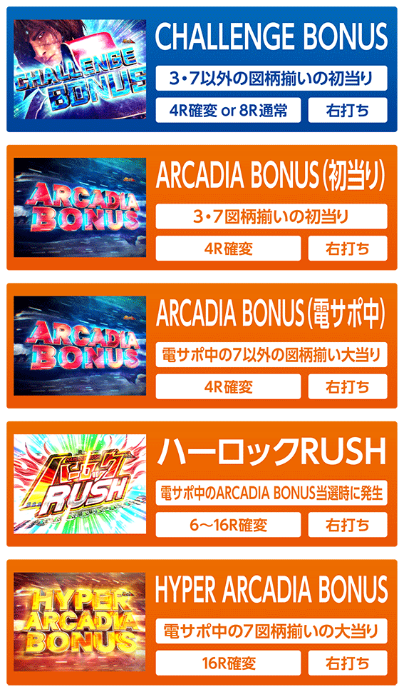 電サポ中の7図柄揃い大当りは16Rの「HYPER ARCADIA BONUS」。ラウンド後はSTが継続。