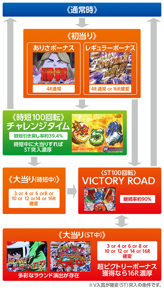 ★初回大当りの大半で突入する時短「チャレンジタイム」中に当たれば、ST「VICTORY ROAD」突入濃厚。