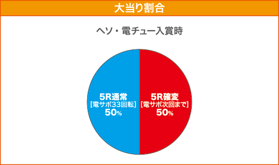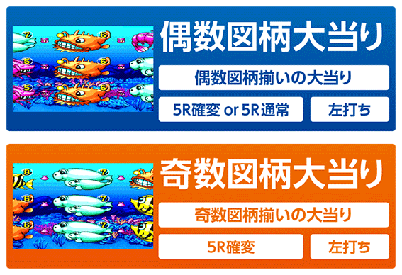 偶数図柄揃いの大当りは5R確変or5R通常。大当りラウンド中やエンディングで確変に昇格することもあり。