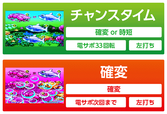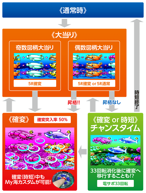 奇数図柄大当り後に突入する確変モードで、滞在中は背景がピンクに変化。確変(チャンスタイム)中もMy海カスタムが設定可能となっている。