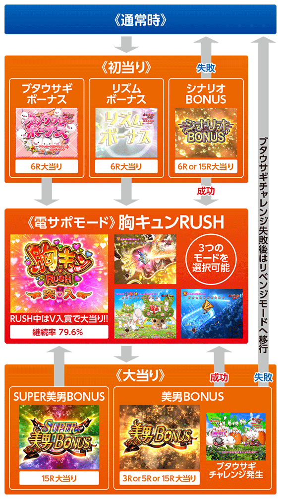 変動中やリーチハズレ後などに「オペチャレンジ」図柄が出現すると発展。テギョンがブタウサギを完成させれば、胸キュンRUSH濃厚のブタウサギボーナスとなる。リーチ中はボタン押しで出現するセリフに注目!