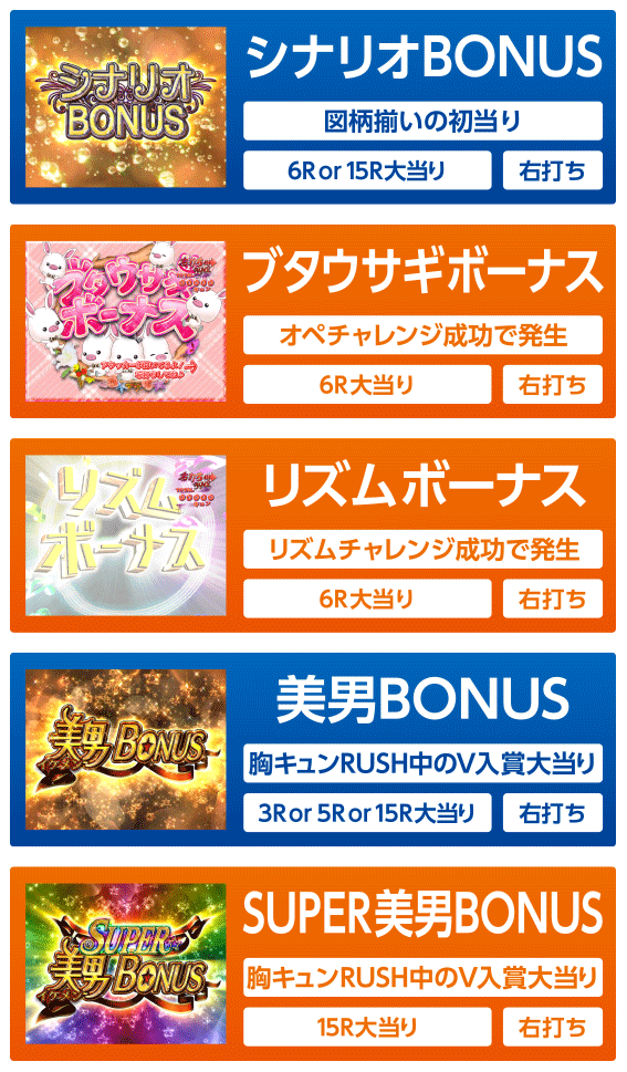 胸キュンRUSH中のV入賞で発生する大当り。ラウンド中に発生するブタウサギチャレンジに成功すれば3R大当り+胸キュンRUSH継続で、失敗した場合は5R大当り(胸キュンRUSH非突入)となる。なお、ラウンド中に胸キュンアローが可動すればSUPER美男BONUSへ昇格。