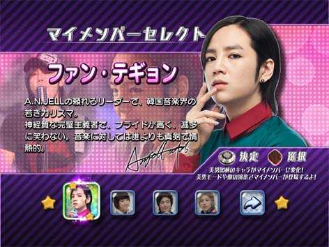 待機中にプッシュボタンを押すと「マイメンバーセレクト機能」で、自分の好きな美男(イケメン)を選択することが可能。選択できる美男は「ファン・テギョン」「コ・ミナム」「カン・シヌ」「ジェルミ」の4人で、選んだ美男は美男図柄や美男モードで登場する。