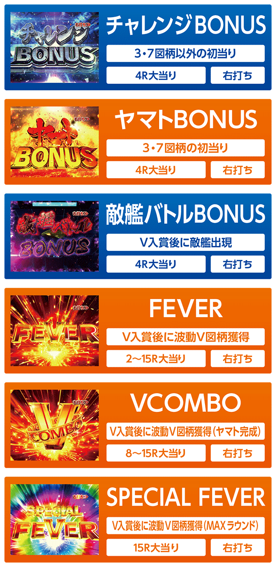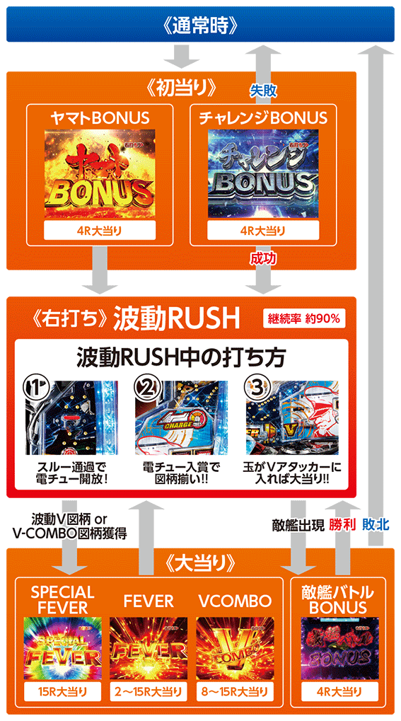 図柄揃い後のV入賞で波動V図柄を獲得すれば、「FEVER」や「SPECIAL FEVER」となり波動RUSH継続濃厚。ヤマトが完成すれば「VCOMBO」獲得となる。