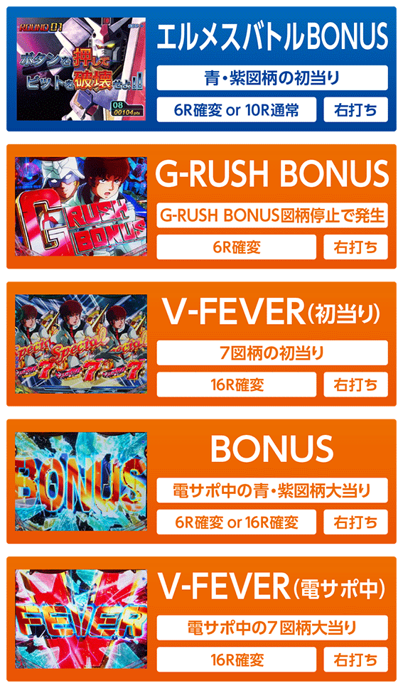 初当りの大半を占めるのが青・紫図柄揃いの「エルメスバトルBONUS」で、ラウンド中の演出によりSTor時短突入が決定。すべてのビット(浮遊砲台)を撃破できればST・G-RUSH突入で、失敗すると時短・G-CHALLENGEへ突入。