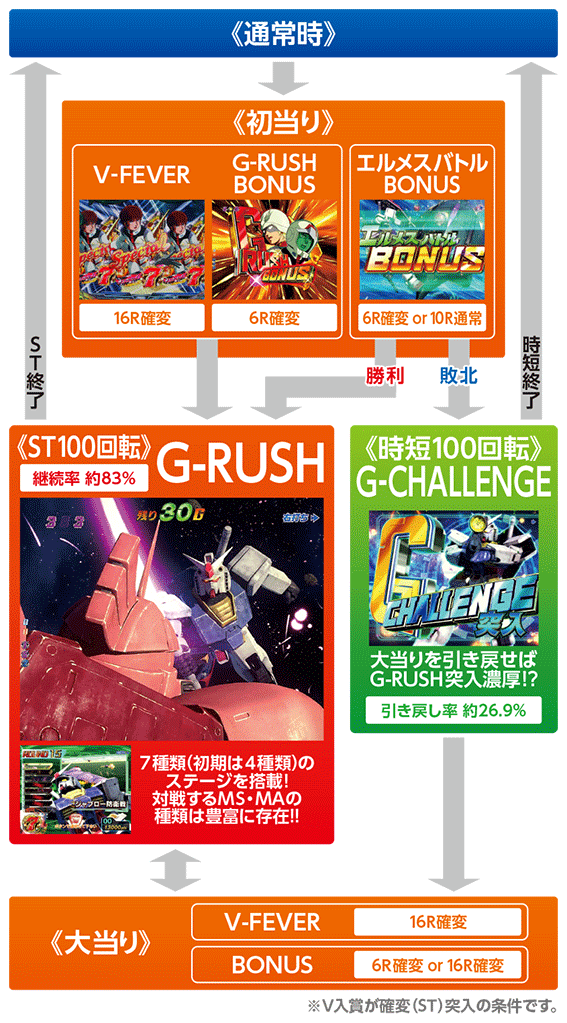 約83%の継続率を誇る本機のSTモード。「V-FEVER」や「G-RUSH BONUS」後、「エルメスバトルBONUS」のラウンド中演出成功で突入する。突入時にST中のステージを4種類の中から選択でき(開放されるステージを含めると全7種類)、ステージによりバトルの視点や、登場するMS・MAの種類が変化。自軍のMSが敵を撃破すれば大当りとなる。