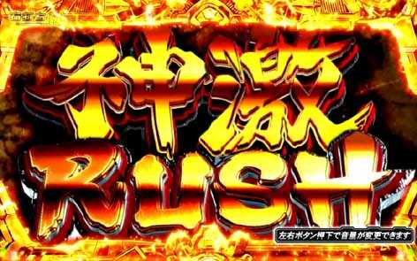 連チャンモード「神激RUSH」への足掛かりとなる電サポモードで、SPリーチ(1R当り)中の演出に勝利or成功すると突入。電サポが1or5or9or100回転継続し、この間に大当りを引けば神激RUSH突入濃厚となる。