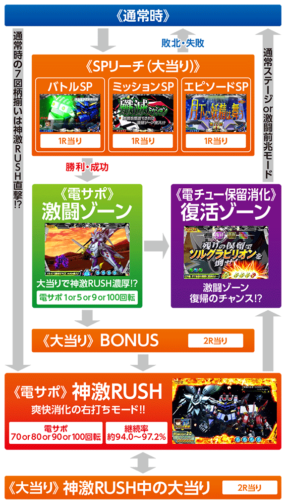 | リーチの種類 | ・楽曲リーチ ・ロボットリーチ ・バトルSP(強パターン) ・ミッションSP(赤タイトル) ・エピソードSP |