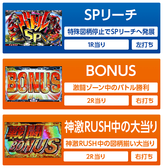 本機は中央に特殊図柄が停止しSPリーチへ発展すれば1R当りとなる。ここで重要なのがSPリーチ中の演出で、演出に勝利or成功すれば激闘ゾーン突入濃厚、敗北or失敗した場合は通常ステージへ移行する。なお、SPリーチは「バトルSP」「ミッションSP」「エピソードSP」の3種類で、「エピソードSP」なら発展した時点で、激闘ゾーン(電サポ5回以上)突入濃厚となる。上アタッカー消化。