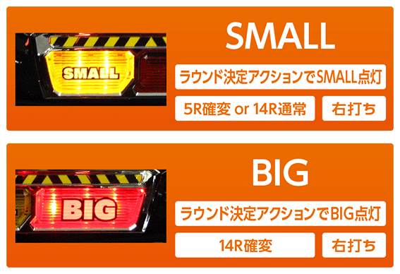 S×1→B×1点滅:約35% S×1→B×2点滅:約62% S×1→B×1高速点滅:約52% S×1→B×2高速点滅:約76% Bのみ点灯:BIG濃厚!? (S=SMALLランプ、B=BIGランプ) |
