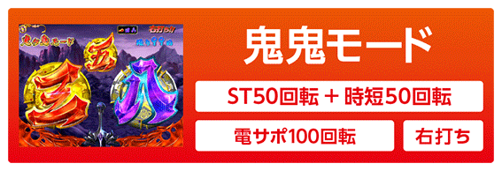 七以外の図柄揃いで突入する5or16R確変。5Rで終了と思いきや役物落下で16R昇格のパターンあり。大当り後は「鬼鬼モード」に突入する。