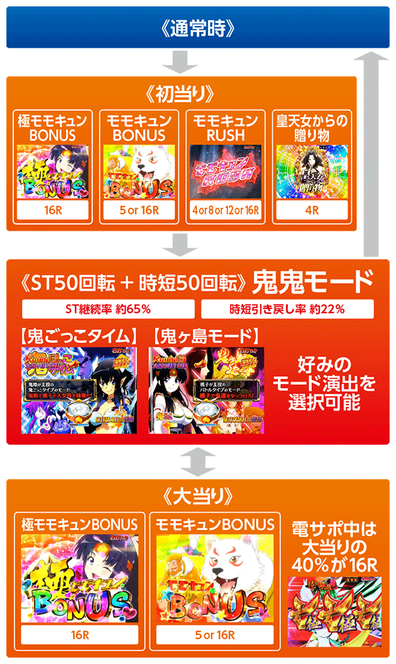 すべての大当り後に突入するST50回転+時短50回転の電サポモード。鬼姫が天女隊を捕まえれば大当りとなる「鬼ごっこタイム」と、桃子と鬼のバトルがメインで展開する「鬼ヶ島モード」のどちらか好きな方の演出を選択することが可能。