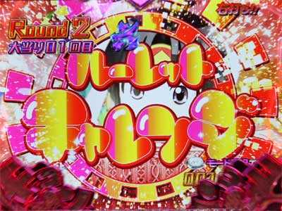 ラウンド中にルーレット演出が発生。ボタン内のレインボーに発光した位置でルーレットが停止すれば、ラウンド終了後の保留内に再び大当り!