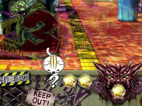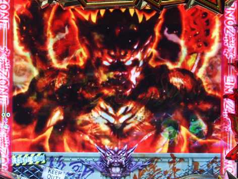 変動中の鬼神登場から突入する高期待度ゾーン。画面左右のオビの色が赤になれば期待度アップ!?
