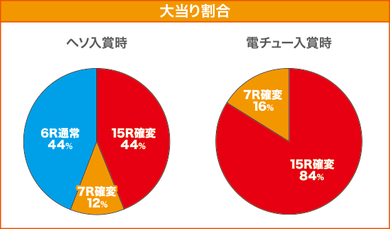 | 確変突入率 | ヘソ入賞時:56% 電チュー入賞時:100% (ST100回転) (ST継続率 約64.8%) |
