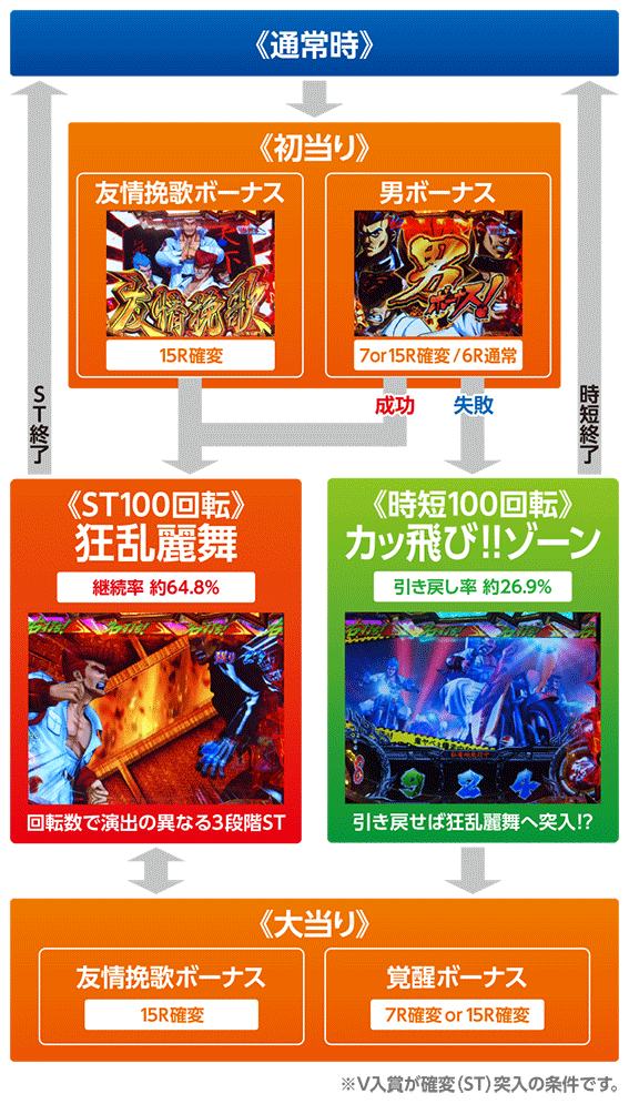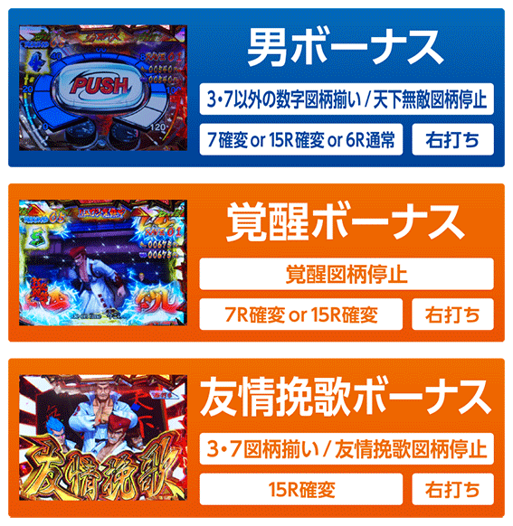 3・7以外の数字図柄揃いや、天下無敵図柄停止は「男ボーナス」。ラウンド中に発生するブンブンルーレットに成功すればST「狂乱麗舞」へ突入、失敗した場合は時短「カッ飛び!!ゾーン」へ突入する。ブンブンルーレット成功後に鬼浜インパクトが炸裂すれば15Rの友情挽歌ボーナスへ昇格。