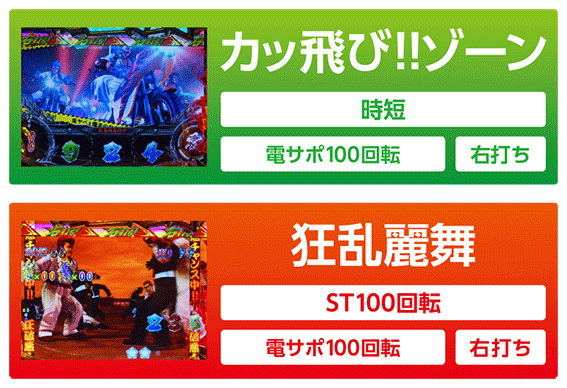 男ボーナスのラウンド中演出失敗で突入する100回転の時短モード。大当りを引き戻すことができれば「狂乱麗舞」突入濃厚(電チュー入賞時に限る)。