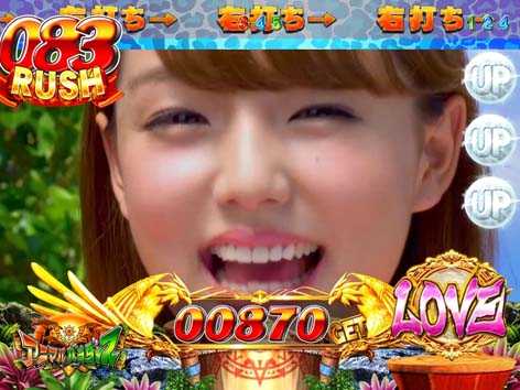 RUSH回転数の上乗せは「後告知タイプ」。演出では篠崎愛ちゃんの歌や踊りを楽しむことができる。