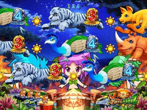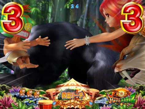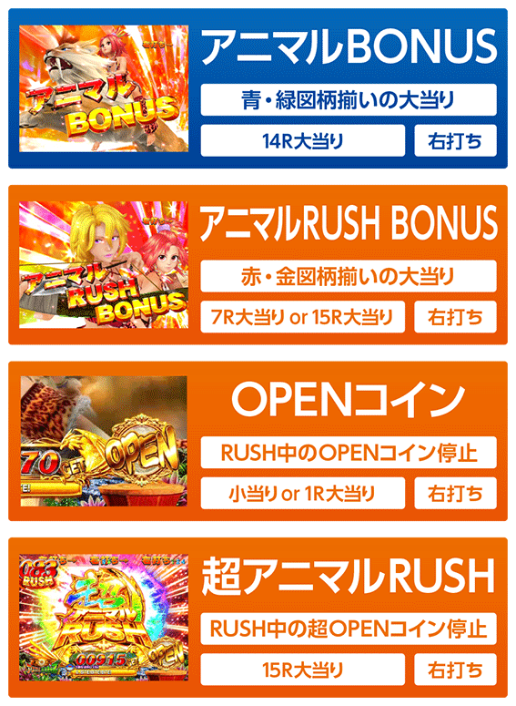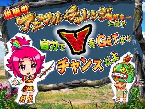 青・緑図柄揃いの大当りは14Rの「アニマルBONUS」。ラウンド中に発生するアニマルアタックで「挑戦」が3つ揃いになれば完全自力Vチャンスの「アニマルチャレンジ」獲得となり、アニマルチャレンジでアタッカーに玉が入ればアニマルRUSHへ突入。アニマルチャレンジを獲得できなかったり、獲得できても失敗した場合は通常時へ移行する。