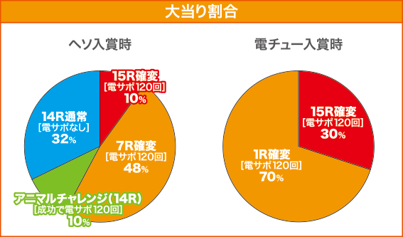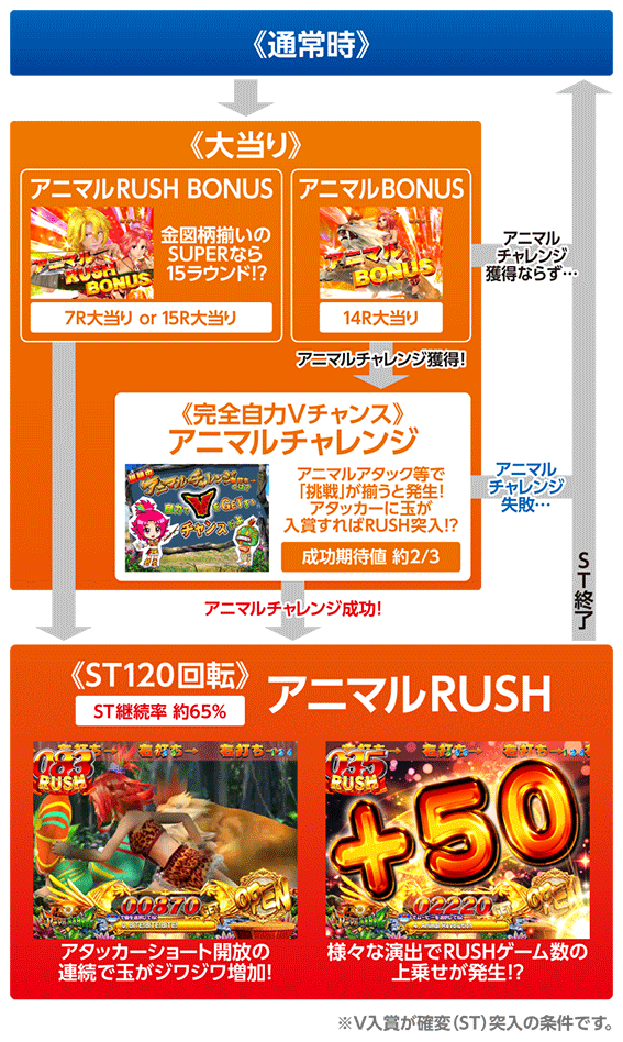 | 確変突入率 | ヘソ入賞時:約65%(注) 電チュー入賞時:100% (ST120回転) (注)アニマルチャレンジ成功含む |