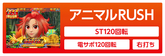 本機のSTモードで「アニマルRUSH BONUS」後や、「アニマルBONUS」中にアニマルチャレンジに成功すると突入。滞在中は約2分の1で小当りが当選し、出玉を増やしながらSTを消化することができる。また、小当りと1R大当りの演出が同じ(OPENコイン停止)なので、RUSHがどこまで続くかはわからない。