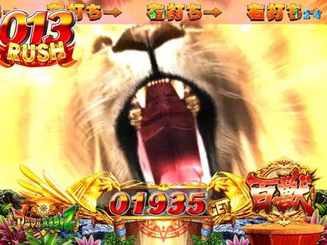 百獣の王・ライオンが爪で画面を切り裂き大当りを狙う。大当りすればSUPERアニマルRUSH BONUS濃厚!?
