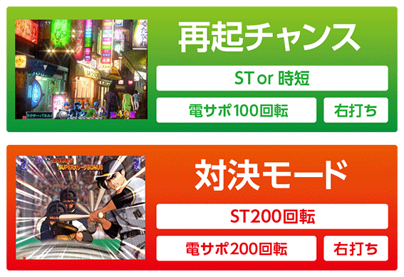 (SUPER)大リーグBONUS後や燃焼BONUS後、明子チャンスの演出成功時などに突入するST200回転。滞在中はストーリーリーチやキャラクターリーチに成功、もしくは野球対決に勝利すれば大当り+モード継続、野球対決に敗北した場合は大当り+再起チャンス突入となる。