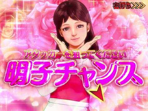 変動停止時やリーチハズレ後などに明子が登場し、さらに振り向くと6R大当りの「明子チャンス」をゲット。ラウンド中はストーリーリーチや頂上決戦リーチ同様のチャレンジ演出が発生し、演出に成功すればST・対決モード突入、失敗した場合は通常時へ移行する。頂上決戦が選ばれた場合は対決モード突入濃厚!?