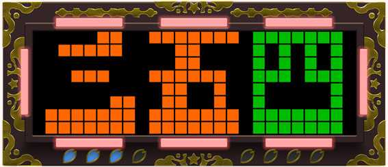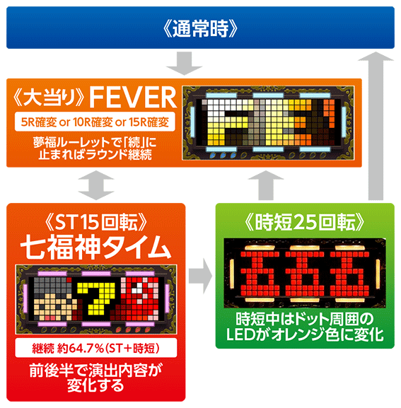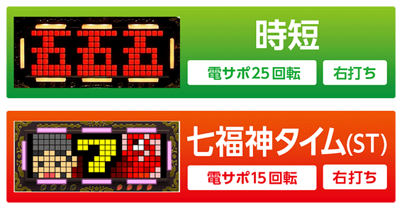 ST「七福神タイム」終了後に突入し、25回転継続。時短中はカラードット周囲のLEDがオレンジ色になるぞ。なお、時短中の演出は通常時と同様のものが発生する。