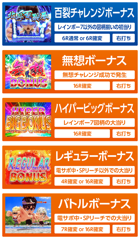 レインボー7以外の図柄揃いの初当りは6Rの「百裂チャレンジボーナス」。ラウンド中に発生する百裂チャレンジに成功すればVアタッ獲得で海王モード突入、失敗した場合は思い出モード突入となる。右打ち表示時にキレパンダが登場すれば百裂チャレンジ成功!?