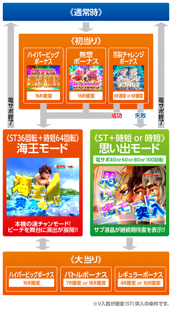 レインボー7以外の図柄揃いの初当りは6Rの「百裂チャレンジボーナス」。ラウンド中に発生する百裂チャレンジに成功すればVアタッ獲得で海王モード突入、失敗した場合は思い出モード突入となる。