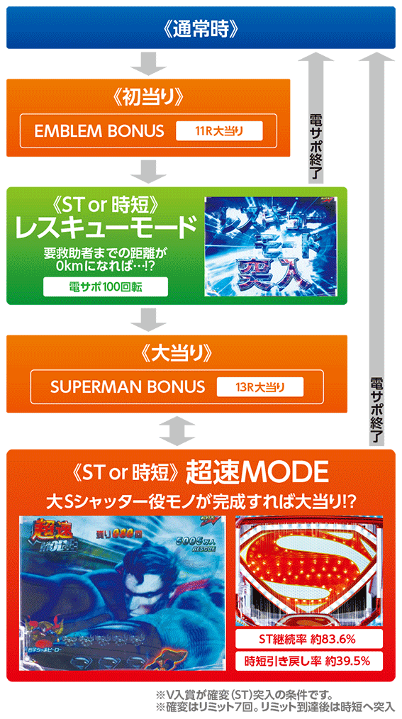大Sシャッター役モノ完成から発展する本機最強リーチ。実写リーチやアメコミリーチ前半経由など多彩な発展パターンを持っている。ラストはボタン押しでスーパーマンが飛び立てば大当り!?