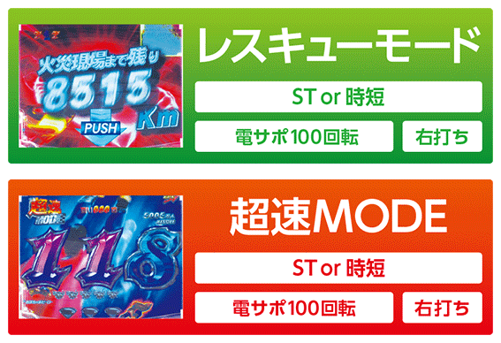 ★初当り後はかならず電サポ100回転の「レスキューモード(STor時短)」に突入し、ここで大当りを引くことができれば連チャンモードの「超速MODE」へ!!