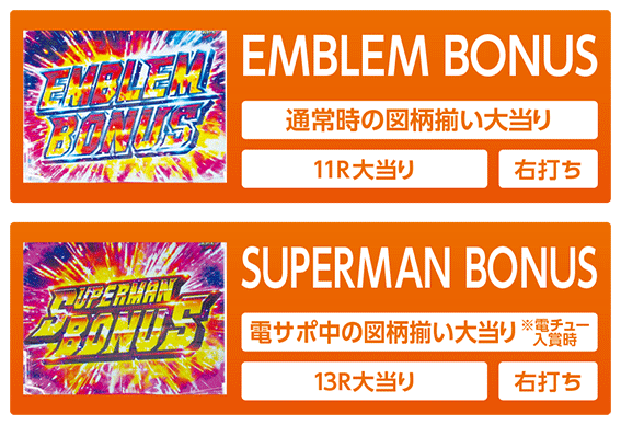 スーパーマンVS敵のバトルがアメコミ調で展開。どのリーチも「VS」のタイトルが出現する後半発展で期待度アップ。強予告発生時などは後半からスタートすることも!!