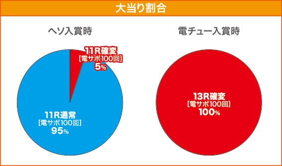 | 確変突入率 | ヘソ入賞時:5% 電チュー入賞時:100% (ST100回転) (確変リミット7回) |