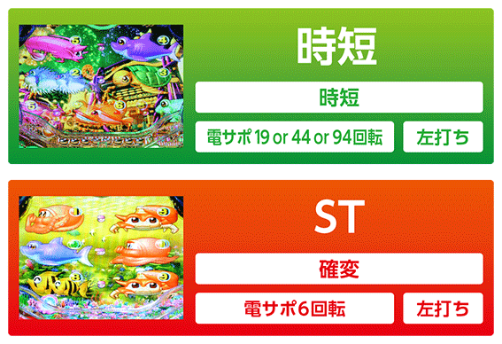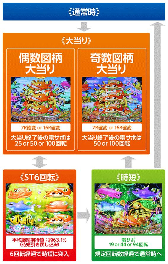 | 先読み演出 | ・保留変化予告(赤系変化・魚系変化) ・リーチ連続予告 ・チャンス目前兆予告 |
