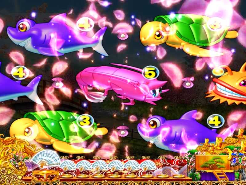 ジャパンモード中のスーパーリーチは、リーチ中のボタン押しで泡or魚群のどちらが出るかが重要。新演出の豪華絢爛リーチは大漁旗のカットインから発展し、図柄が桜吹雪に乗って画面手前へ押し寄せる。