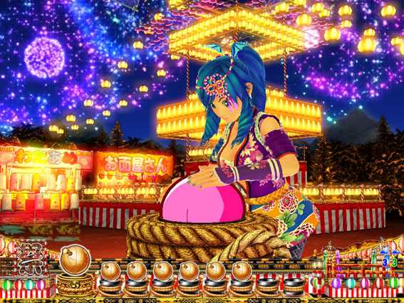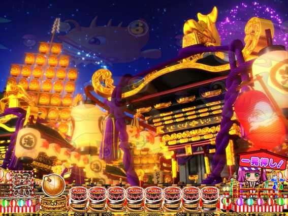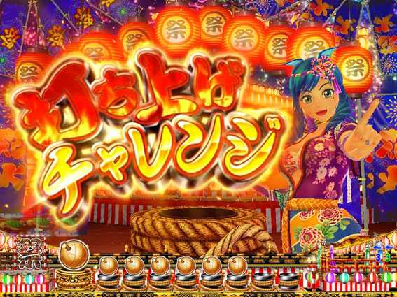 お祭りモードはスーパー発展時に、どの方向へ画面スクロールするかで発展先が決定。左へ向けば「図柄神輿リーチ」、右へ向けば「仕掛け花火リーチ」or「盆踊りリーチ」、上へ向けば大チャンスの「和太鼓リーチ」へ発展する。打ち上げチャレンジはどの方向からも発展する可能性があり、ボタン押しで花火が咲けば大当りだ!