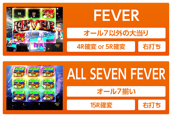 オール7停止(7図柄がすべてのマスに停止)で発生する、15Rの確変大当り。終了後は熱狂a-nationへ突入する。