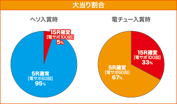 | 確変突入率 | ヘソ入賞時:5% 電チュー入賞時:100% (ST60回転) |