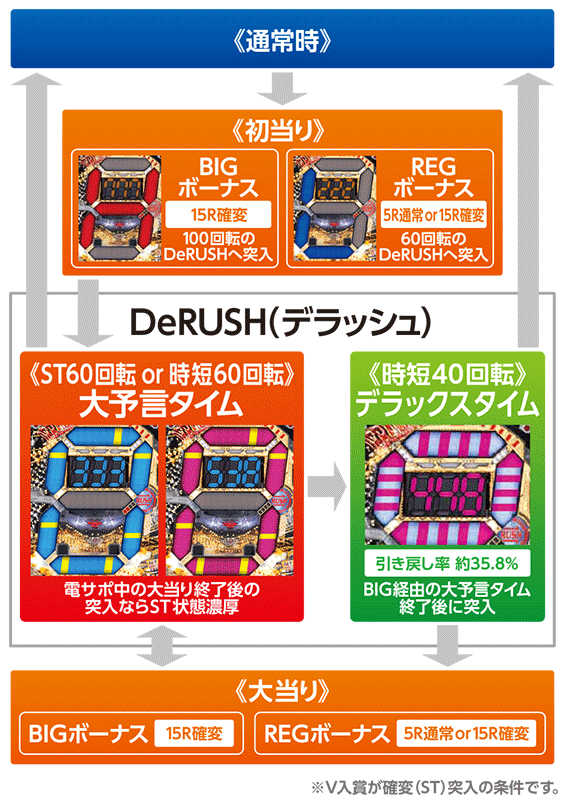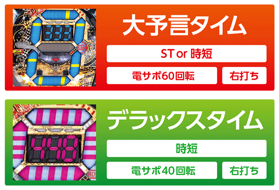 | 通常時の15R大当り終了後 | ST60回転(大予言タイム)+時短40回転(デラックスタイム) | |